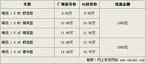 筆者了解,目前鋒范的優惠幅度仍然保持最高2000元的優惠幅度,其中1.5排量優惠現金1000元,精英版和舒適版均有不用顏色現車供應,部分款色還需要預訂,1.8排量最高優惠現金2000元。消費者到店還可以有一定幅度的讓利。部分經銷商還有禮包增送。