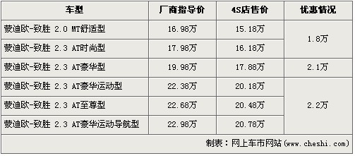 據4S店銷售人員介紹:在售的蒙迪歐-致勝共有6款車型,近期購買的消費者最高可以得到2.2萬元的優惠。入門級的2.0L手動舒適版以及2.3L自動時尚版經1.8萬元的優惠后,售價分別降為了15.18萬元和16.18萬元,2.3L自動豪華版經2.1萬元優惠后,售價降到了2.1萬元。2.3L豪華運動版、至尊版以及豪華運動導航版經全系最高的2.2萬元優惠后,售價分別降為了20.18萬、20.48萬以及20.78萬元。