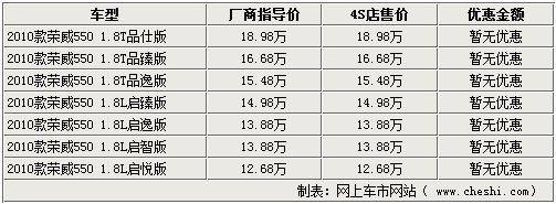 據銷售人員表示,目前購買2010款榮威550車型僅贈送一些保養及裝飾,同時,各店2010款榮威550車型也比較充裕,顏色齊全,購車用戶無需預訂,其他4S店也基本維持這個銷售狀態。而老款550車型,不論是1.8T還是1.8L車型均已售空。