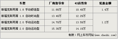 據(jù)北京福特4S店銷售人員介紹:目前購買兩廂福克斯的消費(fèi)者最高可以得到1.4萬元的優(yōu)惠。1.8L手動舒適版經(jīng)1.4萬元優(yōu)惠后,售價降到了10.49萬元。1.8L自動時尚版以及2.0L的運(yùn)動版車型有1.2萬元的優(yōu)惠,優(yōu)惠后售價分別降到了12.29萬元、13.59萬元和14.19萬元。