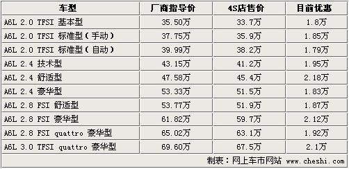 據(jù)4S店銷售人員介紹:目前2010款奧迪A6L車系部分車型有現(xiàn)車,2.0T與2.4升車型現(xiàn)車較為充足,顏色包括銀色和黑色,每款車型具體情況有所不同。2.8升排量車型目前現(xiàn)車較少,只有個(gè)別款有現(xiàn)車,顏色為黑色,如需預(yù)定需等1個(gè)月以上。優(yōu)惠方面,奧迪A6L全系最高優(yōu)惠2.18萬元,優(yōu)惠幅度較穩(wěn)定。