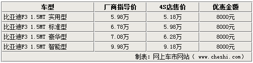 據比亞迪汽車4S店銷售人員介紹,目前比亞迪F3智能白金版只有實用型、標準型和豪華型有現車銷售,智能型和自動擋車型都現車不足,即使預訂也無法得知具體到店時間。現在購買比亞迪F3智能白金版可以有較大的優惠幅度,其中實用型,豪華型以及標準型均可以優惠8000元;而智能型也可以優惠8000元,但需要預訂。該比亞迪4S店銷售人員表示,如果到店詳談,還可以有更多的優惠幅度。
