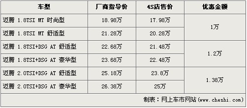 邁騰是一汽大眾主打中級車市場的車型,自上市以來一直受到了好評。今年3月份搭載DSG雙離合變速器的全新邁騰上市,缸內(nèi)直噴發(fā)動機匹配DSG雙離合變速器的完美結(jié)合另邁騰再一次的成為了焦點。近日據(jù)網(wǎng)上車市價格系統(tǒng)監(jiān)測顯示,邁騰全系最高優(yōu)惠1.38萬元,具體價格詳情請看下表: