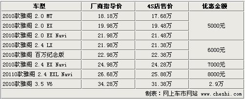 雅閣一直是中級車市場最受矚目的車型之一,棱角分明的外觀以及舒適的內飾空間以及豪華程度成為眾多商務人士最佳選擇。廣州本田在推出2010款車型后,使雅閣整車的性價比進一步提升。據網上車市價格監測系統顯示:目前雅閣的優惠幅度有所降低,最高優惠2.9萬元。具體車型行情如下:
