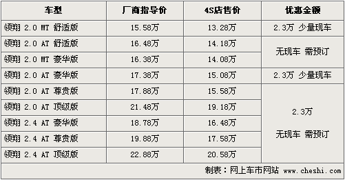 北京現(xiàn)代索納塔領(lǐng)翔于08年底正式上市銷售,為了提高領(lǐng)翔在同級(jí)別車型中的競爭力,在原有車型基礎(chǔ)上,領(lǐng)翔又新增了兩款車,并提高了多款車型的配置,提高了整車性價(jià)比。根據(jù)網(wǎng)上車市價(jià)格監(jiān)測系統(tǒng)顯示,目前領(lǐng)翔全系優(yōu)惠進(jìn)一步增加,最高可優(yōu)惠現(xiàn)金2.3萬元。具體行情如下: