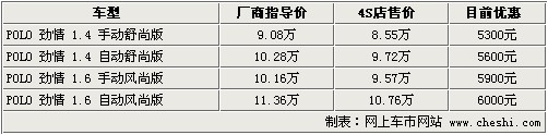 據4S店銷售人員介紹:目前POLO勁情全系僅為4款車型。之前的1.4升手動擋兩款車型合并為1.4手動舒尚版,1.4升自動擋兩款車同樣合為1.4自動舒尚版。其余1.6升兩款車型不變。目前全系最高優惠6000元,其余三款車優惠幅度都有所不同。目前全系現車比較少,個別車型僅有1-2臺現車。但目前有在途中車輛,最短等待1周,最長等待2周時間。我們建議購買銀色、藍色、紅色車款,這3種顏色車型預定時間短,且店內個別車型有此顏色現車。