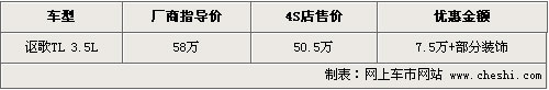 09新款的謳歌TL在去年12月份正式進入國內市場銷售,相比之前老款車型,09款在外觀、性能、排量上均有不同程度的提升。目前這款車可以優惠現金7.5萬元,同時還有部分裝飾贈送,具體行情如下: