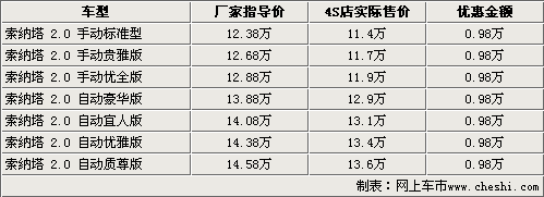 索納塔作為北京現(xiàn)代銷售的第一款車型,在中國(guó)地區(qū)銷售了已經(jīng)快7年了。隨著新車型的增加,索納塔已經(jīng)漸漸的失去了市場(chǎng)競(jìng)爭(zhēng)力了。在4月的上海國(guó)際車展上,北京現(xiàn)代展出了自主研發(fā)車型新索納塔BT01,一經(jīng)亮相就立刻受到了中國(guó)消費(fèi)者的關(guān)注。近日我們從北京現(xiàn)代內(nèi)部人士處獲悉到,主研發(fā)車型新索納塔BT01將于7月份正式推出。與此同時(shí),根據(jù)網(wǎng)上車市價(jià)格監(jiān)測(cè)系統(tǒng)顯示,目前銷售的索納塔全系均出現(xiàn)了大幅優(yōu)惠,2.0標(biāo)準(zhǔn)版車型的售價(jià)僅為11.4萬(wàn)。具體車型售價(jià)見下表: