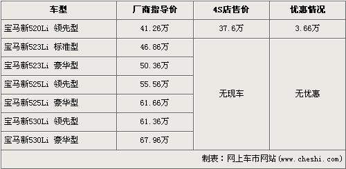 據北京寶馬經銷店的銷售人員介紹,目前購買寶馬新520Li領先型可以得到3.66萬元的優惠,經優惠后新520Li領先型的售價從41.26萬元降到了37.6萬元。銷售人員還介紹,目前店內除了520Li領先型有現車外,其它車型均無現車,欲購買的消費者需交定金2萬元,約等1個月后可提車。