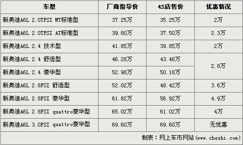 據4S店銷售人員介紹,目前奧迪A6L全系可以最高優惠4.9萬元。奧迪A6L全系分為2.0TFIS,2.4L,2.8FSI,3.0FSI四種共10個車型,最低配的2.0TFSI標準型經2萬元優惠后售價從37.25萬元下降到了35.25萬元,而2.8FSI 豪華版經全系最高的4.9萬元優惠后售價也降到了56.92萬元。全系最高配的3.0FSI quattro豪華版目前店內沒有現車,欲購買的消費者需要交1萬元訂金,約等3個月后方可提車。