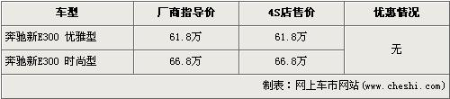 據北京奔馳4s店銷售人員介紹,奔馳新E級先期上市的車型為E300優雅型和E300時尚型,售價分別為61.8萬元和66.8萬元。前期預訂新E級的車主已經可以到店內提車,近期欲購買奔馳新E級的消費者需交1萬元訂金,9月份才可提車。