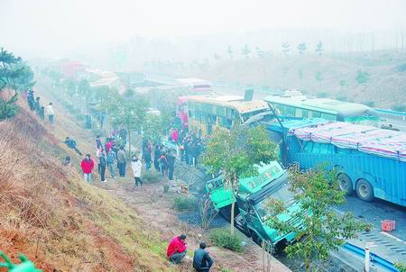 前天上午9時(shí)許,滬陜高速商城至固始段突起大霧,該路段商城服務(wù)區(qū)東800米處10余輛汽車發(fā)生連環(huán)相撞,造成1人死亡。