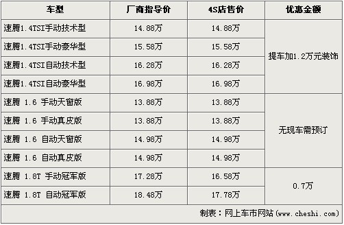 自來(lái)勢(shì)洶洶的速騰1.4TSI車(chē)型于9月份上市以后,一汽大眾旗下主打緊湊車(chē)市場(chǎng)的速騰車(chē)系隊(duì)伍再次得到了擴(kuò)大,同時(shí)也得同級(jí)競(jìng)爭(zhēng)車(chē)型帶來(lái)了強(qiáng)烈的競(jìng)爭(zhēng)。近日據(jù)網(wǎng)上車(chē)市價(jià)格系統(tǒng)檢測(cè)顯示,速騰1.4TSI提現(xiàn)車(chē)須在店內(nèi)加裝價(jià)值1.2萬(wàn)元的裝飾,具體車(chē)型價(jià)格詳情請(qǐng)看下表: