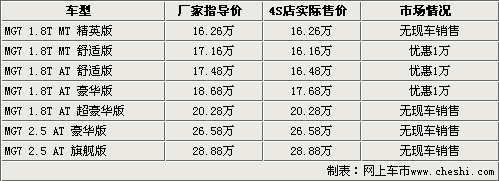 名爵作為南汽收購引入國內的品牌,在國產后保留了原汁原味的英倫風格。給平淡的中高級車市場帶來一股異域風情,其中代表車型就是名爵MG7。名爵MG7從內而外都具有英倫氣質,流線的車身設計,古典的大燈造型以及內飾中控臺的風格,從一上市就得到時尚消費者的親睞。近日根據網上車市價格監測系統顯示,目前購買名爵MG7最高可以享受到1萬元的現金優惠。具體車型見下表: