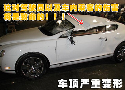 而這輛白色的賓利歐陸GT雖然車身損傷不是很嚴(yán)重,但是車頂部分已經(jīng)完全塌陷。駕駛員位置車頂和座椅之間已經(jīng)沒有安全的空間,駕駛員存活的可能性較小,后排如果有乘客也將是“兇多吉少”。