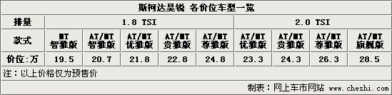 上海大眾斯柯達推出的全新B級車Superb昊銳,將于8月18日上市宣布價格。目前首批展車已經運抵北京部分斯柯達4S店,近期部分經銷商還將舉辦小規模的試駕賞車活動。與此同時記者也以消費者的身份詢問了北京地區多家斯柯達授權經銷商,通過詢問我們得知了斯柯達昊銳的預售價格區間為19.5-28.5萬元,共分為9款車型: