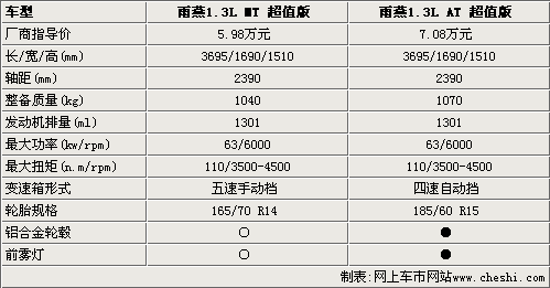 從圖表中可以看到,雨燕的兩款超值版價格相差1.1萬元,在性能和配置方面都有一些不同之處。首先,雨燕超值版的車身尺寸和軸距都沒有任何變化,但自動擋車型的整備質量比手動重30kg。另外,在動力搭配相同的情況下,雨燕1.3L AT超值版匹配四速自動變速箱,所以加速和高速行駛的表現不會超過手動擋車型。不過雨燕1.3L AT 超值型采用了15寸輪胎和鋁合金輪轂,而且還配備了手動擋所沒有的前霧燈,其他配置方面并無差異。