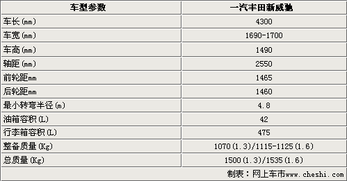 豐田新威馳的車身尺寸與老款相同,長寬高分別達到了4300mm、1690-1700mm和1490mm,完全滿足了家庭A0級轎車的身材,同時也滿足了年輕消費者對轎車的使用需求。2550mm的軸距確保了新威馳的內部空間,完全可以為一家三口出行提供服務。新威馳的最小轉彎半徑僅為4.8m,保障了其在窄小道路的通過型。豐田新威馳的行李箱和油箱的容積分別達到了475升和42升,對于一個A0級的小車來說絕對稱得上是大號的了。