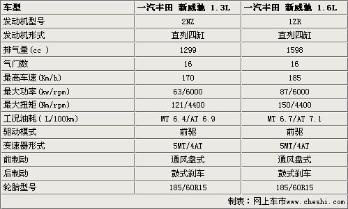 豐田新威馳將繼續搭載1.3L和1.6L兩款發動機,來滿足不同消費者的需求。這兩款發動機都是直列4缸16氣門引擎,具有可變節氣門技術,在保證強勁動力輸出的同時,又可以達到了良好的節油性能,1.6L自動擋車型的百公里油耗僅為7.1L,1.3L手動擋車型的油耗更為節省,百公里油耗不到6.4L。在動力輸出方面,1.3車型的最大功率和最大扭矩分別達到了6.3Kw和121Nm,同時1.6車型的最大動力輸出也達到了87Kw和150Nm。在同級車中絕對稱得上是出類拔萃。在變速器方面,分別裝配上了5速手動變速器和4速手自一體變速器。新威馳的制動器均為前盤后鼓式制動器。
