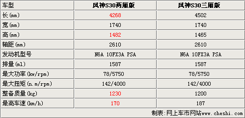 風神S30兩廂版在尾部的車身結構上有明顯變化,所以整車的參數也會隨之改變。通過與三廂車型的參數對比發現,風神S30兩廂版的車身尺寸有了明顯變化,其中長度縮短了234毫米,高度則增加了17毫米。雖然外形尺寸有明顯變化,但風神S30兩廂版的軸距并無改變,保障了后排的空間優勢。風神S30兩廂版依然采用PSA 1.6L發動機,但整備質量增加了30公斤,多少會影響整車的動力性能,最高車速只能達到170公里每小時。