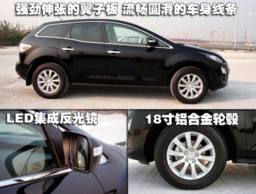 強勁有力的翼子板在車身中部得以適量的過度,其在車尾部再次伸張,配以車窗周圍的鍍鉻裝飾條,賦予了CX-7更為前衛的定義。車身整體線條設計流暢圓潤,反光鏡集成了LED轉向燈,最為顯眼的當屬輪轂,CX-7裝配了18寸多幅鋁輪轂,并配備了普利司通高級輪胎,為高速穩定性及駕駛安全性起到了關鍵作用。