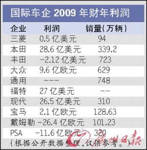 2009年中國成功晉身為全球最大的汽車產銷市場,中國汽車集團的賺錢能力也水漲船高,中國三大汽車集團東風、上汽和一汽集團各自的純利潤高達260億元人民幣(約合38億美元),遠遠超過全球聲名顯赫的豐田、大眾、通用,即使與財政情況較好的本田、福特、現(xiàn)代汽車(25億~27億美元)相比,盈利能力也遙遙領先。“如果一個汽車企業(yè)年營業(yè)額在幾百億元,而利潤只有區(qū)區(qū)幾千萬元,那實在是沒什么意思。”一位中國車企的高層信心十足地對記者這樣說。
