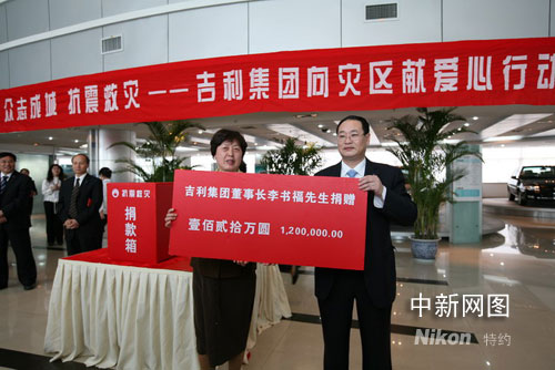 中新網5月14日電 5月12日汶川巨震,震動全國。吉利集團在第一時間展開了專題會議,聯合開展捐車、捐錢、獻血活動,攜經銷商、供應商首批捐款突破千萬。其中吉利集團董事長李書福當場個人捐款120萬元,四川省駐浙辦事處領導參加并接受了吉利對災區的捐款。