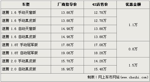 據北京一汽大眾經銷店銷售人員介紹,在上海車展上亮相的速騰1.4TSI最早將會在下個月上市銷售,預售價格可能不會低于16萬元,此車的上市將會取代目前在售的速騰2.0升自動擋車型。近期購買速騰在售車型的消費者都可以得到不同程度的優惠,速騰1.6L車型優惠1.1萬元,1.8T冠軍版車型優惠8000元,2.0L車型優惠金額達到了全新最高的1.5萬元,但是2.0L車型目前店內無現車,預購買者需交訂金1000元,約等一周后可提車。
