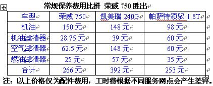 僅從配件的費用來看,帕薩特領馭1.8T和榮威750的價格優勢明顯,考慮到上海大眾保養工時收費較高,綜合看來,榮威750使用3年在保養費用的支出上最具優勢,而凱美瑞240G不但配件價格昂貴,據了解保養一次的工時收費在200元左右,是三款車型中最貴的,日常使用成本較高。