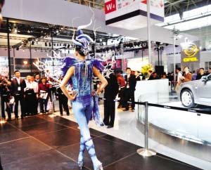 ①VOLVO在這次車展上,開了兩個非常特別的展區。一個展示上衣和褲子;一個用電子系統教你畫畫,看來廠家為了銷售自己的理念越來越“不務正業”了。