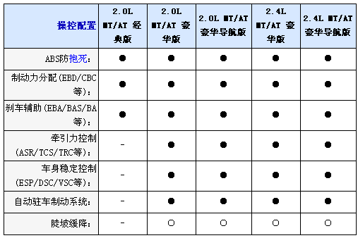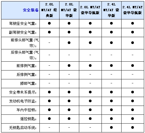 內飾方面2.0L均配備織物座椅,而2.4L車型則采用真皮坐椅并且配備電加熱座椅,并且2.0L配備6向手動調節駕駛座椅,而2.4L配備8向電動調節并且代腰部支撐的駕駛座椅,不過副駕駛全車系只標配4向手動調節座椅,另外入門級車型只配備CD播放器,2.0L和2.4L豪華型采用6CD播放器,而2.0L和2.4L豪華導航型配備DVD播放器和6.5寸寬屏液晶顯示器;包括導航功能,全系標配6喇叭揚聲器、多功能方向盤自動分區空調和后排足部出風口。