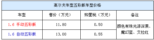 目前店內有的五彩版高爾夫有深黑、魔幻藍、艾拉紅三種顏色的現車,而且手動自動車型均有車銷售。而現在高爾夫五彩版高爾夫的售價則是手動車型11.7萬、自動版13萬元。目前購車還能得到店方贈送的全額購置稅。據了解目前店內對五彩版高爾夫車型還有大幅度的優惠,車價直降1萬元,而加上店方贈送的購置稅使得高爾夫的性價比更高。