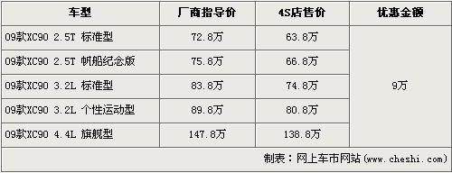 據(jù)沃爾沃經(jīng)銷(xiāo)商處銷(xiāo)售人員介紹,目前店內(nèi)的09款XC90車(chē)型全系都有9萬(wàn)元的現(xiàn)金優(yōu)惠,并且此次優(yōu)惠活動(dòng)截止到7月1日。經(jīng)優(yōu)惠后,2.5T標(biāo)準(zhǔn)型的售價(jià)跌破70萬(wàn)元,僅售63.8萬(wàn)元。2.5T 帆船紀(jì)念版經(jīng)9萬(wàn)元優(yōu)惠后,售價(jià)從75.8萬(wàn)元下降到了66.8萬(wàn)元。兩款3.2L排量車(chē)型經(jīng)優(yōu)惠后售價(jià)降為74.8萬(wàn)元及80.8萬(wàn)元,頂配的4.4L旗艦車(chē)型售價(jià)降為了138.8萬(wàn)元。銷(xiāo)售人員還介紹,XC90全系車(chē)型齊全,消費(fèi)者挑選的空間較大。