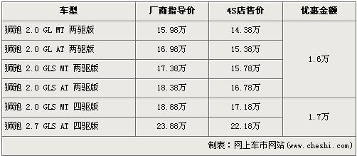 根據(jù)北京東風悅達起亞經(jīng)銷店銷售人員介紹,09款獅跑共分為6款車型,其中2.0L車型為5款,動力更強勁的2.7L車型為1款,目前09款獅跑全系都有優(yōu)惠,兩驅(qū)版車型優(yōu)惠1.6萬元,四驅(qū)版車型優(yōu)惠1.7萬元。經(jīng)優(yōu)惠后,入門級的手動2.0 GL兩驅(qū)版售價從15.98萬元下降到了14.38萬元。四驅(qū)版車型經(jīng)1.7萬元優(yōu)惠后,手動2.0L GLS版售價從18.88萬元降到了17.18萬元,而排量更大的自動2.7L GLS版售價從23.88萬元下降到了22.18萬元。現(xiàn)車方面,經(jīng)銷商處已有現(xiàn)車并且非常充足,消費者挑選的空間很大。