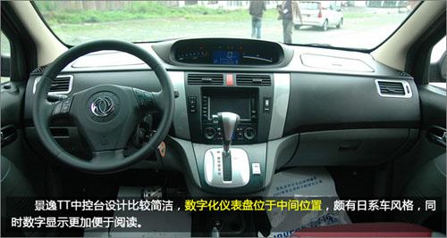 景逸TT的儀表盤位于中控的正中央,紅色的背光特別醒目,發(fā)動機轉速、車輛時速、油料情況、音響、空調控制等信息都能得到充分的顯示。中控臺上采用人機工程學原理設計的各種按鍵,簡單易用,處處體現(xiàn)了人性化關懷的設計元素。而且,“景逸TT”換擋桿也移至了中控臺上,不僅使用順手便利,更為駕駛員右側騰出了更大的活動空間。