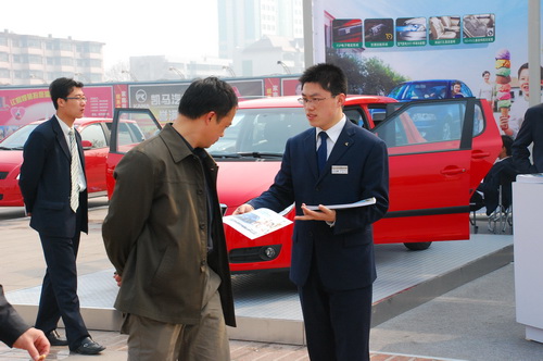 中新網4月19日電在2009(第六屆)全國百強縣市汽車巡展壽光站的現場筆者發現了這樣的一幕,與其他廠商不同,上海大眾斯柯達的經銷商濰坊天和汽車銷售服務有限公司的銷售人員,不但在展位為前來咨詢的消費者進行講解,而且還走出展位,走到展位外面為消費者講解,吸引消費者來了解更多車輛信息。
