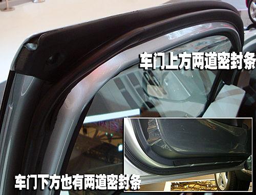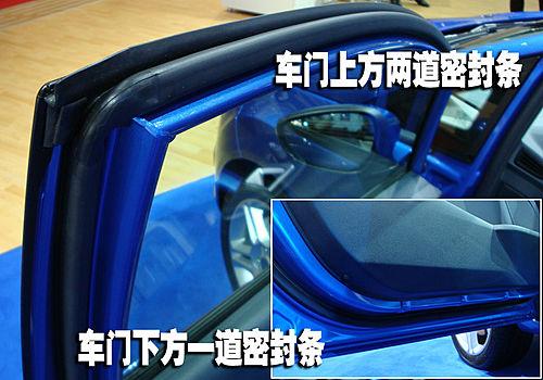 新嘉年華在車門上方提供了兩道密封、車門下方為一道密封,同樣的在車身門框的位置也提供了一圈密封條。不過記者仔細觀察卻發(fā)現(xiàn)新嘉年華的密封條質地比較柔軟,并且這臺展車已經(jīng)出現(xiàn)了一些扭曲的現(xiàn)象。