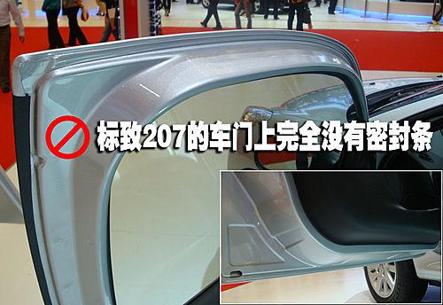 標致207在車門一側(cè)完全沒有設(shè)計密封條,在其車門上也沒有任何可以固定密封條的固定點。不過在車身一側(cè)門框的位置設(shè)計了兩道密封,不過盡管是這樣標致207依然是這項對比中最差的一個。