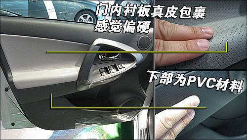 門內扶手為皮革包裹,但感覺偏硬。門內襯板為塑料材質。