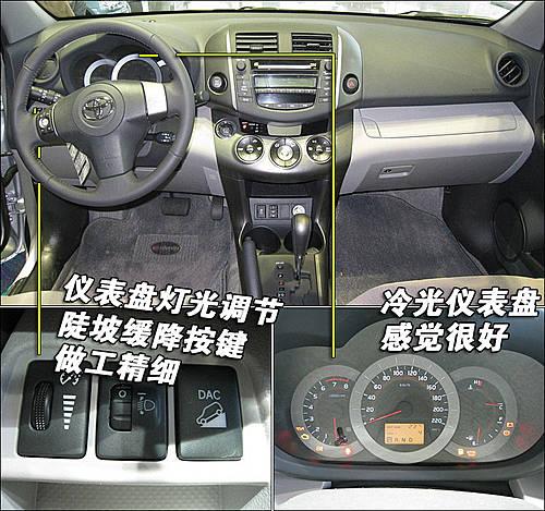 豐田國(guó)產(chǎn)RAV4凸顯出該車的運(yùn)動(dòng)風(fēng)格,在內(nèi)飾設(shè)計(jì)上采用深色設(shè)計(jì)。兩小一大的冷光儀表盤,感覺很舒服,駕駛員可以查看比較輕松。儀表盤燈光調(diào)節(jié)、陡坡緩降按鍵位于方向盤左側(cè),用料感覺相對(duì)比較精細(xì)。