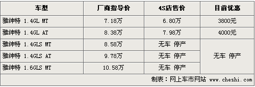 筆者從北京地區(qū)經(jīng)銷商處了解到,目前雅紳特各4S店均沒(méi)有現(xiàn)車供應(yīng),需要預(yù)訂,訂金需要交納1000元左右,15個(gè)工作日內(nèi)可以交車。雅紳特共有五款車型,但目前在售的只有1.4手動(dòng)標(biāo)準(zhǔn)和自動(dòng)標(biāo)準(zhǔn)兩款,車價(jià)方面,這兩款可分別優(yōu)惠3800元和4000元,其他三款據(jù)銷售人員介紹,均已經(jīng)停產(chǎn)。