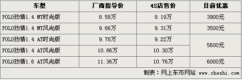 據(jù)4S店銷售人員介紹,目前POLO勁情現(xiàn)車比較緊張,只有少數(shù)車型有現(xiàn)車供應(yīng),同時(shí)各款車型在價(jià)格上的優(yōu)惠幅度也不一樣。1.4入門(mén)級(jí)車型優(yōu)惠現(xiàn)金3900元,其他各款優(yōu)惠從3500元-6000元不等。另?yè)?jù)銷售人員介紹,消費(fèi)者如果預(yù)訂車型的話,需要先交訂金排隊(duì),一個(gè)月左右才能順利提到車現(xiàn)車。