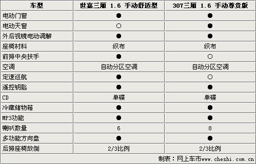 由于兩款車型都是1.6的高配車型,多以在配置方面比較全面。電動門窗、外后鏡電動調(diào)節(jié)、遙控鑰匙和后排座椅放倒功能都是它們的標(biāo)配。不僅這樣,它們還配備了一些中高級轎車才配備的冷藏功能手套箱和自動雙區(qū)空調(diào)。但是仔細(xì)看下來各兩款車型還是各自都有各自的特點,雪鐵龍世嘉三廂配備了定速巡航,可以大大減少駕駛員長途駕駛的疲勞。標(biāo)致307則配備了電動天窗。在音響方面,307的8揚(yáng)聲器可以讓乘客更好的體會到音樂的樂趣。兩款車型都配備了方向盤音響調(diào)節(jié)功能。