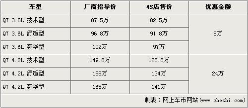 據(jù)經(jīng)銷商銷售人員介紹,奧迪Q7分為3.6L和4.2L兩種排量共7款車型,目前全系最高優(yōu)惠為25萬(wàn)元現(xiàn)金。3.6L車型優(yōu)惠5萬(wàn)元,優(yōu)惠后售價(jià)分別為:技術(shù)型82.5萬(wàn)元,舒適型91.8萬(wàn)元,豪華型97萬(wàn)。排量更大的4.2L車型優(yōu)惠更是達(dá)到了24萬(wàn)元,優(yōu)惠后售價(jià)分別為技術(shù)型125.8萬(wàn)元,舒適型134萬(wàn)元,豪華型141萬(wàn)元。