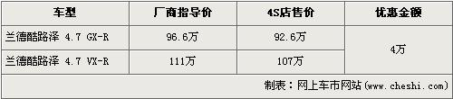 據經銷商銷售人員介紹,豐田-蘭德酷路澤分為4.0L和4.7L兩種排量,由于4.0L車型的尾氣排放是歐III標準,沒有達到北京施行的歐IV標準,所以北京限賣,店內沒有4.0L車型。4.7L車型分為GX-R版和VX-R版,目前購買蘭德酷路澤的消費者可以得到4萬元的優惠。經優惠后,GX-R版售價降為了92.6萬元,VX-R版售價降到了107萬元。銷售人員還介紹,店內沒有蘭德酷路澤現車,預購買者需交訂金1萬元,約等一個半月可提車。