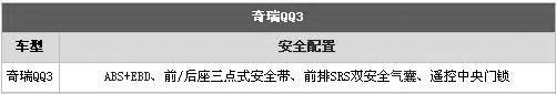作為老資格的QQ3在安全方面沒有讓我們失望,從表中我們看到QQ3配備ABS+EBD,這在微型車中也是非常出眾的配置。靈活機(jī)動(dòng),價(jià)格低廉,油耗較低是QQ3最大的優(yōu)點(diǎn)。由于QQ3只是一款微型車,內(nèi)部空間不是很寬敞,并非全部符合國(guó)內(nèi)消費(fèi)者主流家庭轎車的選擇標(biāo)準(zhǔn),不過在配置方面,QQ3相比以前有很大提高,其舒適型車配備了動(dòng)力轉(zhuǎn)向、電動(dòng)門窗、電動(dòng)后視鏡、真皮座椅、CD和中央門鎖等。