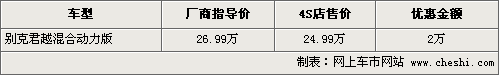 據4S店銷售人員介紹,目前購買君越混合動力車型最高可以優惠現金2萬元,原來指導售價為26.99萬元,優惠后售價為24.99萬元,相當于導航版車型的價格。目前經銷商處有黑色的現車供應。