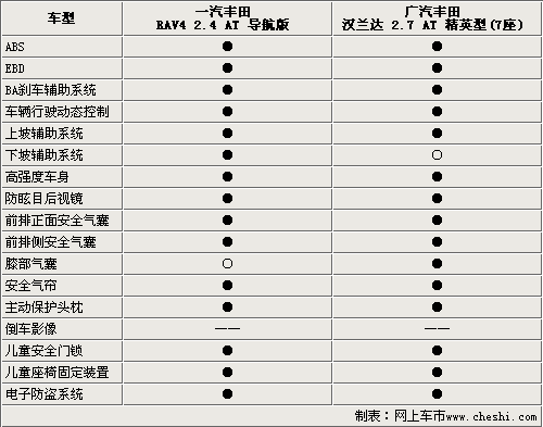 從上表我們可以看到,在電子主動(dòng)安全系統(tǒng)的配備中,ABS+EBD、動(dòng)態(tài)穩(wěn)定系統(tǒng)和6安全氣囊均成為了一汽豐田RAV4 2.4自動(dòng)導(dǎo)航版和廣汽豐田漢蘭達(dá)2.7精英型7座的標(biāo)準(zhǔn)配置。但仔細(xì)看下來它們還是略有不同。豐田RAV4再配備了上坡輔助系統(tǒng)的同時(shí),還配備下坡輔助系統(tǒng),確保車輛在斜坡上能以穩(wěn)定速度的行駛。而漢蘭達(dá)則是配備了膝部氣囊,可以有效的降低事故發(fā)生后對(duì)乘客的傷害。比較遺憾的是這兩款車型均沒有配備倒車輔助系統(tǒng)。