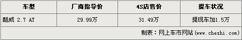 據(jù)4S店銷售人員介紹,在售的道奇酷威為2.7L自動(dòng)檔車型,售價(jià)為29.9萬元。近期購買酷威的消費(fèi)者如要在經(jīng)銷店提現(xiàn)車,需在廠商指導(dǎo)價(jià)29.99萬元的基礎(chǔ)上加價(jià)1.5萬元才可提車,加價(jià)后的價(jià)格增長為31.49萬元。銷售人員還介紹,店內(nèi)只有一輛酷威銀色現(xiàn)車。
