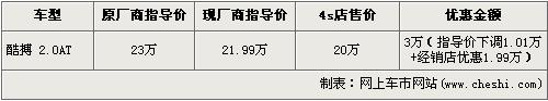 根據(jù)4s店銷售人員介紹,目前官方對(duì)酷搏 2.0 AT版車型的廠商指導(dǎo)價(jià)下調(diào)了1.01萬元,下調(diào)后廠商指導(dǎo)價(jià)從23萬元降到了21.99萬元,并且在店內(nèi)購車的消費(fèi)者還可以得到經(jīng)銷店送出的1.99萬元的優(yōu)惠。經(jīng)總優(yōu)惠后,道奇酷搏的售價(jià)降到了20萬。現(xiàn)車方面,店內(nèi)酷搏現(xiàn)車不多,錯(cuò)過的消費(fèi)者只能交1萬元訂金,下個(gè)月才可提車。